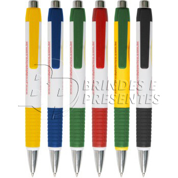 Caneta plástica, retrátil com detalhes coloridos
