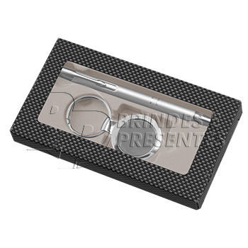 Conjunto de caneta com chaveiro redondo com gravação a laser ou resina na parte central do chaveiro e na caneta impressão a laser ou serigrafia. Tamanho: Metal