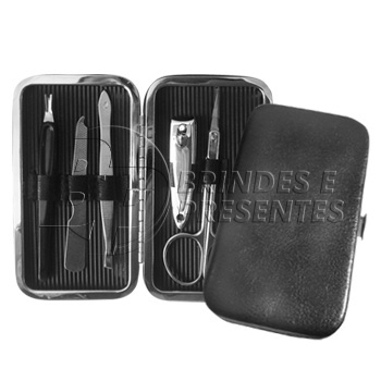 Kit contendo tesoura, cortador, pinça, lixa e removedor de cutículas.